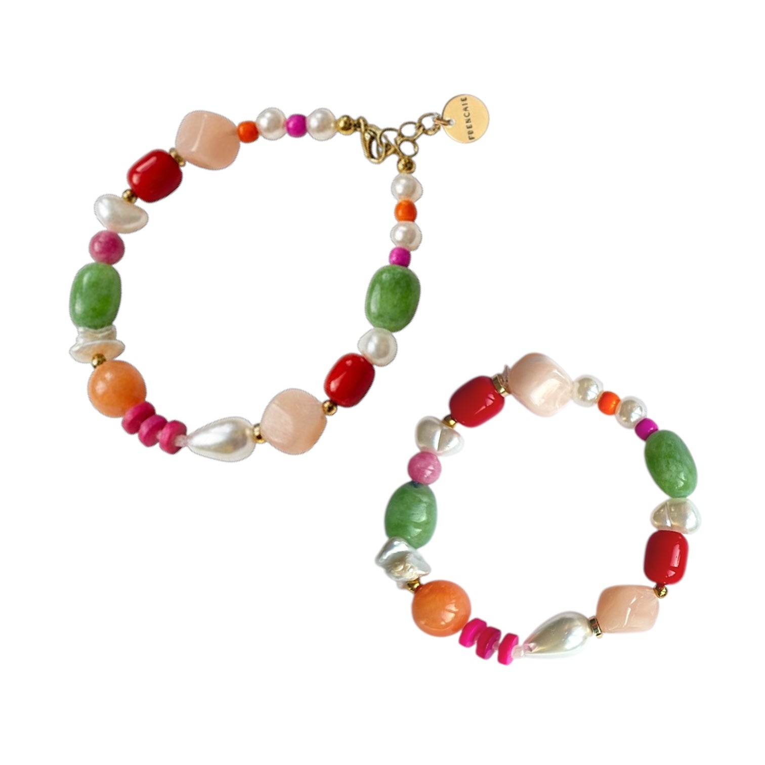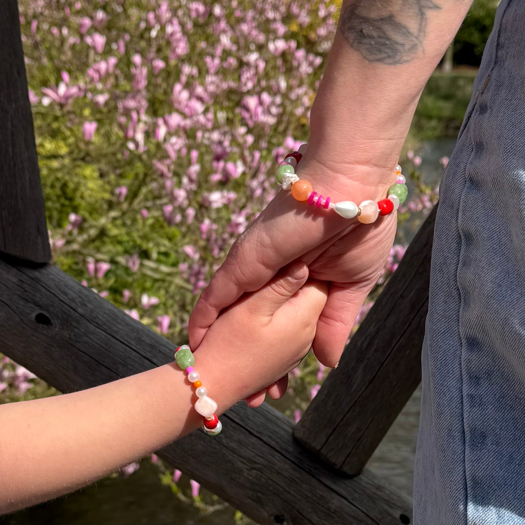 De set bestaat uit twee armbanden, samengesteld uit een verfijnde mix van materialen zoals natuursteen, glaskralen, schelpkralen en resin beads. De sluiting van de volwassen armband is gemaakt van stainless steel, waardoor deze niet verkleurt – zelfs niet bij contact met water.