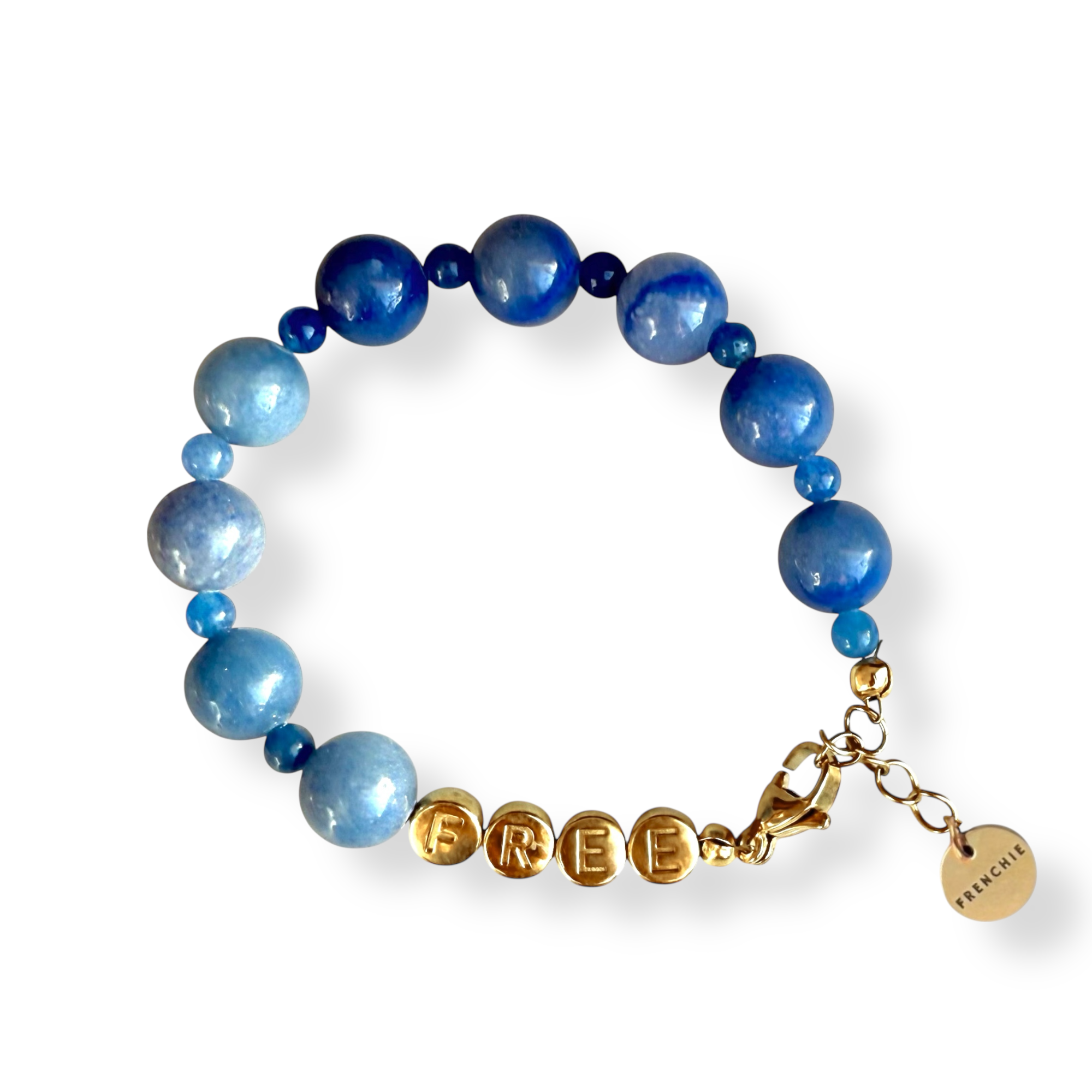 Deze armband is gemaakt van rijke Aquamarijn natuursteen kralen met subtiele gouden letters van stainless steel. Met de boodschap: FREE A GIRL. Een ketting met stijl én betekenis — perfect voor de echte modeliefhebber.