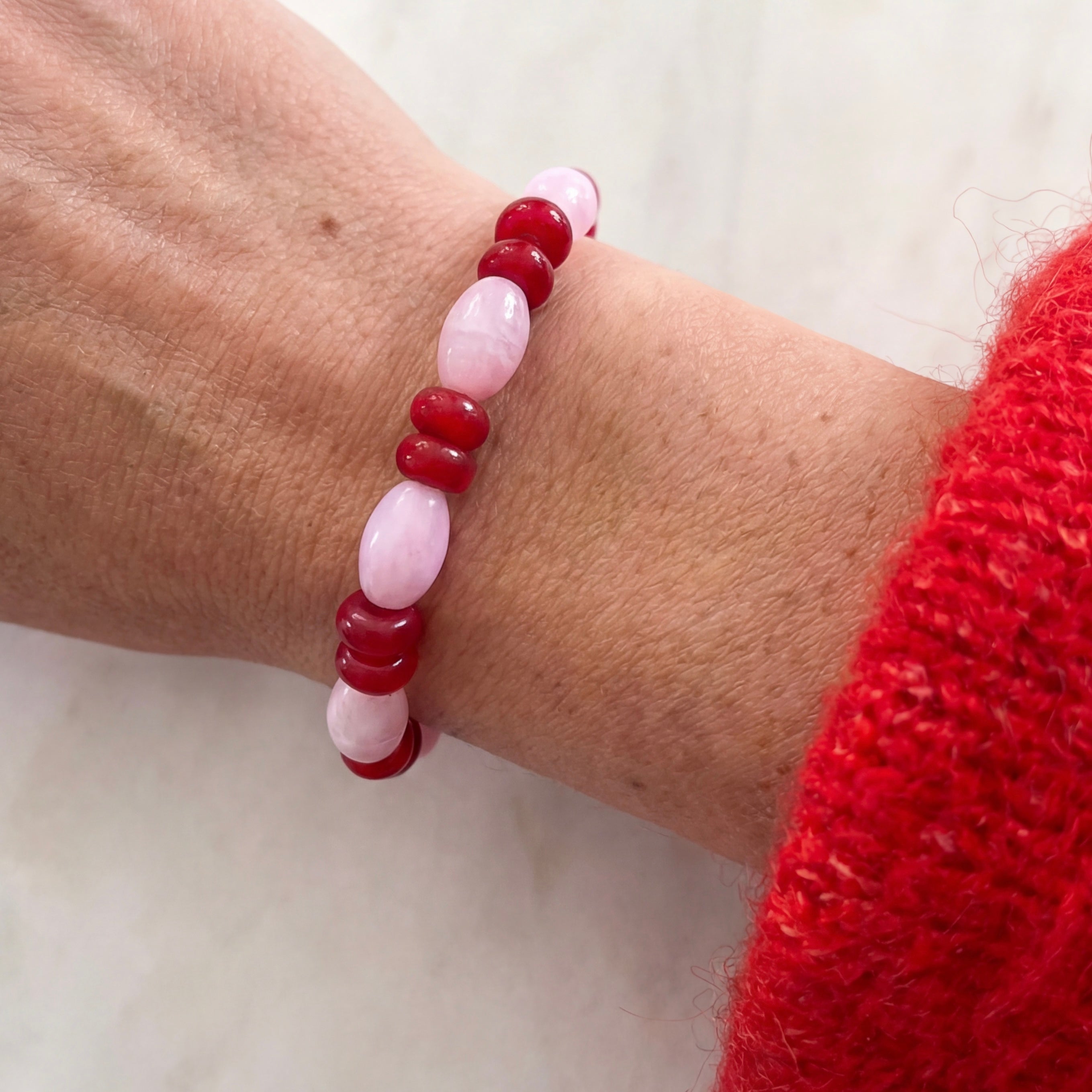 De armband is gemaakt van paarse chalcedoon en rode koraal natuursteen kralen die samen een echte eyecatcher vormen — krachtig, kleurrijk en vol karakter. Met de subtiele gouden stainless steel letterkralen die FREE A GIRL spellen, draag je niet alleen een statement, maar ook een verhaal.