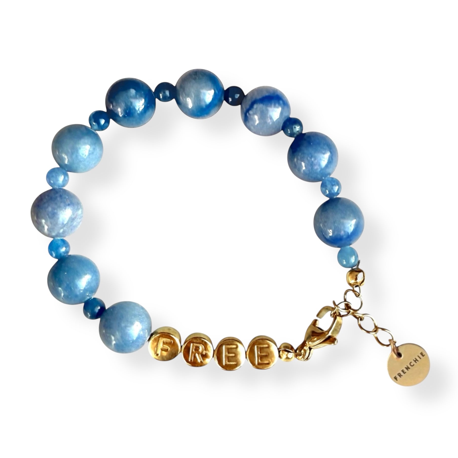 Deze armband is gemaakt van rijke Aquamarijn natuursteen kralen met subtiele gouden letters van stainless steel. Met de boodschap: FREE A GIRL. Een ketting met stijl én betekenis — perfect voor de echte modeliefhebber.