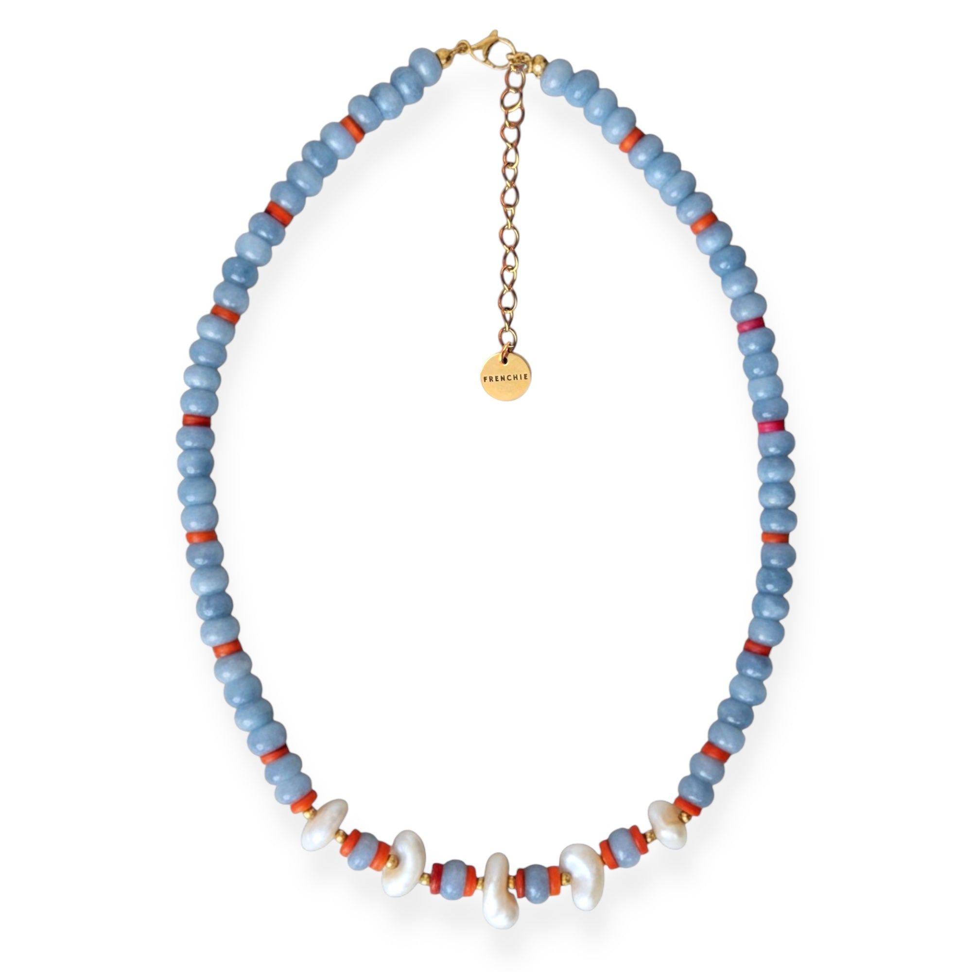 Deze zomerse kralenketting is gemaakt van natuursteen gecombineerd met schelpkralen. De gouden details en de sluiting zijn van stainless steel.