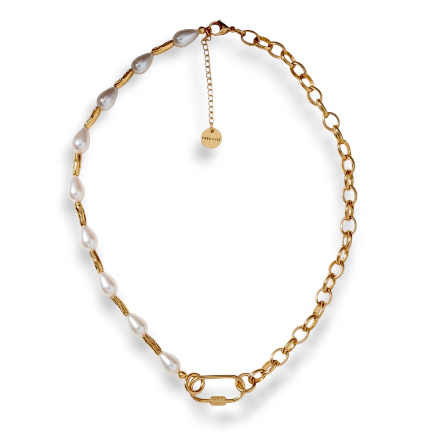 Gold Glam is een parelketting maar dan net even iets anders. Deze ketting is alles behalve saai. Het heeft een chique maar ook stoere look door de verschillende materialen en de gesp sluiting die aan de voorkant gedragen wordt. Deze sluiting leent zich perfect om te combineren met een van onze charms.